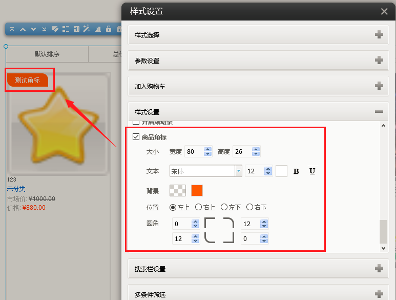 2. 在建站中,拖出“产品列表”插件,在样式设置中开启角标,即可看到角标并设置样式。
