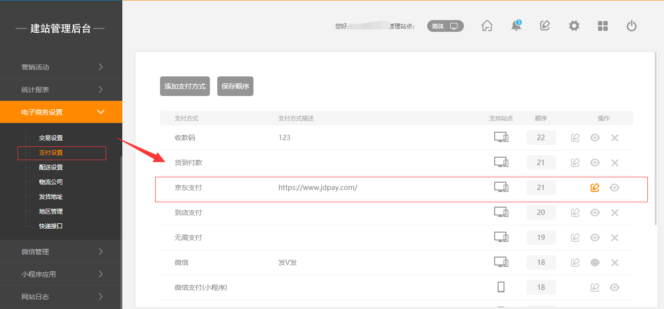 后台-“电子商务设置”-“支付设置”-“京东支付”,点击“编辑”,通过官方链接进行商户账号申请后(注:请选择京东支付)根据京东支付网站中申请提示进行操作,将得到的商户号、密钥等信息填写完全,并上传证书后将其开启,点击保存即可,如图所示: