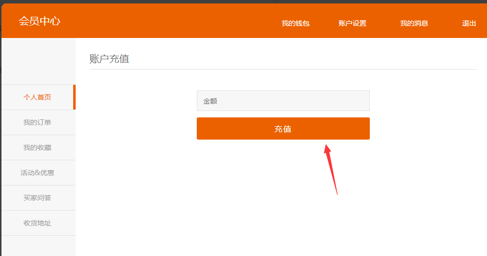 ③.开启之后,前台会员才可以看到充值入口。以pc为例,进入会员中心---我的钱包增加了账户充值和充值记录